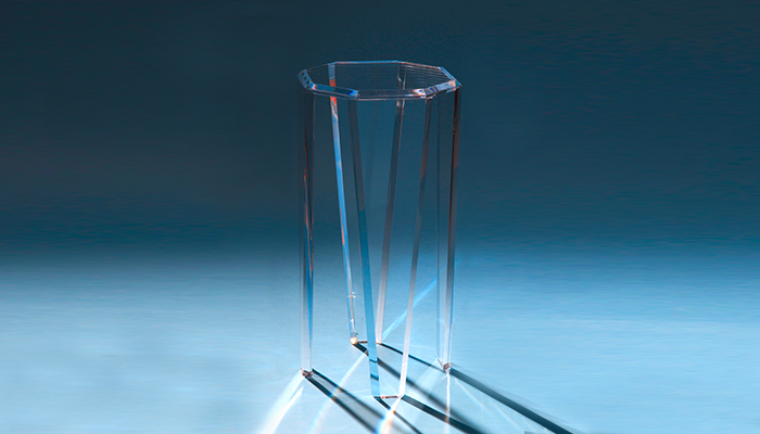 While the Amara table is known for its curves, the Glacia table is all about the angles! Its tapered legs and beveled edges convey the power and presence of the glittering icicles that inspired its design. The Glacia reflects and refracts light in a dazzling array, much like the sun bouncing off the icy peaks of Mt. Kilimanjaro. The Glacia is made of ¾” acrylic, measures 12” in diameter, and stands 24” tall. It is available in both clear and smoke acrylic.