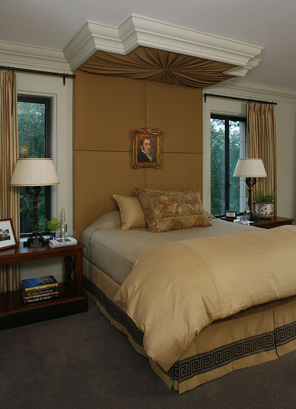 Above is a bed we designed for a client in Manhattan. The room has little architectural interest, so we created some with this very clean version of a half tester bed, which we covered in a very tailored wool. To the left is a bed where we extended the crown moulding around a modified canopy. A starburst silk insert in the ceiling and a full-height headboard unite the design. Because of the window curtains flanking the bed, no bed hangings were needed or wanted.