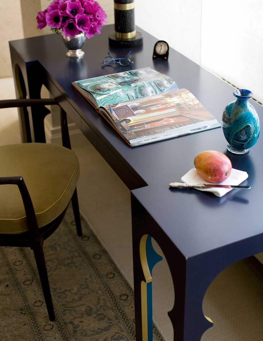 For last spring’s Kips Bay Show House, we sought to incorporate a subtle exoticism into our design. For the serenely neutral space, we designed a custom, jewel-toned desk inspired by India. With its combination of rich aubergine, vivid peacock blue and mustardy gold, it stands out as the jewel in the crown.