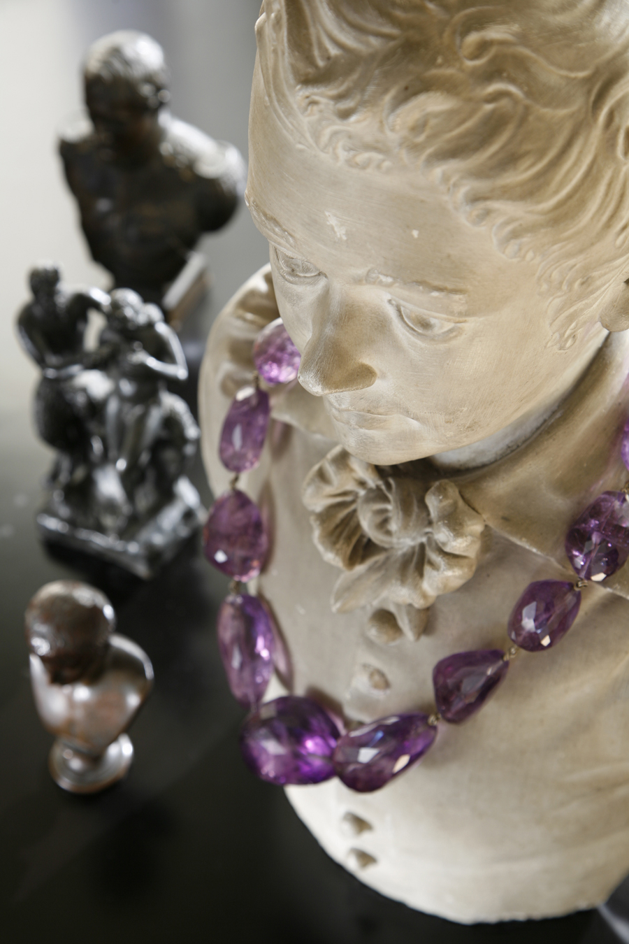 If you really want to replicate the perfect jewel tone, there’s nothing better than the real McCoy. For a touch of theater and a bit of fun, we adorned this charming bust with a chunky necklace of amethysts, purchased in Rajasthan. It’s a delightful way to inject color into your interiors…and keep your best jewels on display!