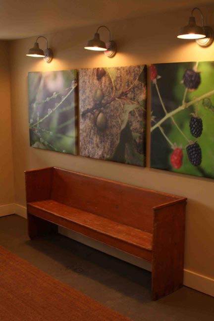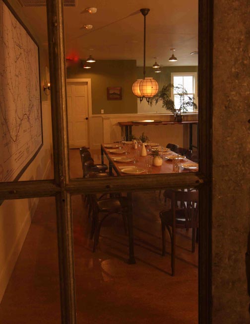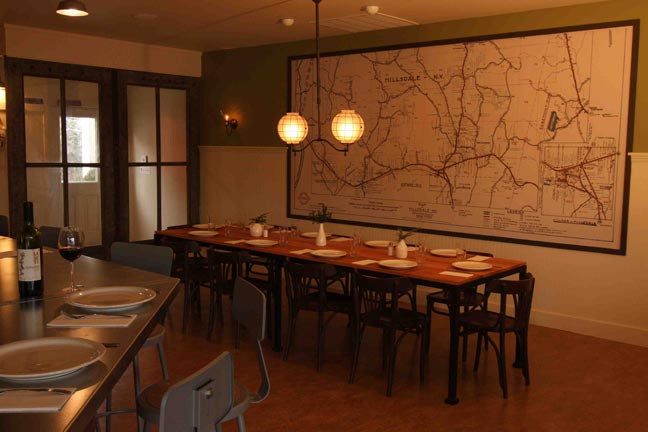CR-barBecause his restaurant is in the same building as my General Store, I was eager to help. I found a fantastic pair of zinc doors from an early 20th century factory, these helped define a “rural-industrial” look that I felt was a good fit. Barn lighting, bead-board wainscoting and simple tables and chairs fleshed out the unpretentious look.