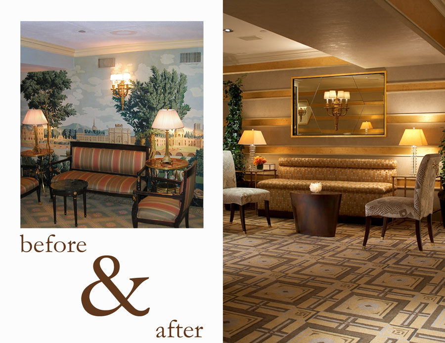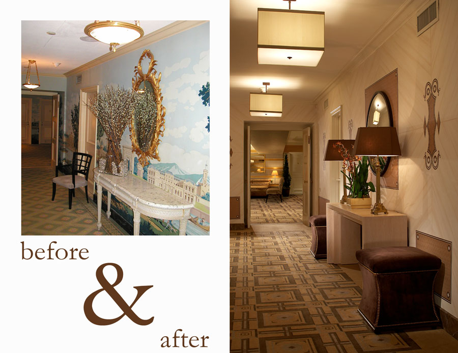 For our recent redesign of banquet rooms at the Carlyle Hotel we took fussy, dated rooms and made them into spaces that are fresh and inviting. In the elevator vestibule (above), we created a one-of-a-kind wallpaper to give the space a feeling of openness, especially as compared to how it was before. The design creates a bridge from the Art Deco period of the building to the twenty-first century. The look is further enhanced by a modern console table and classic gilt-bronze lamps.