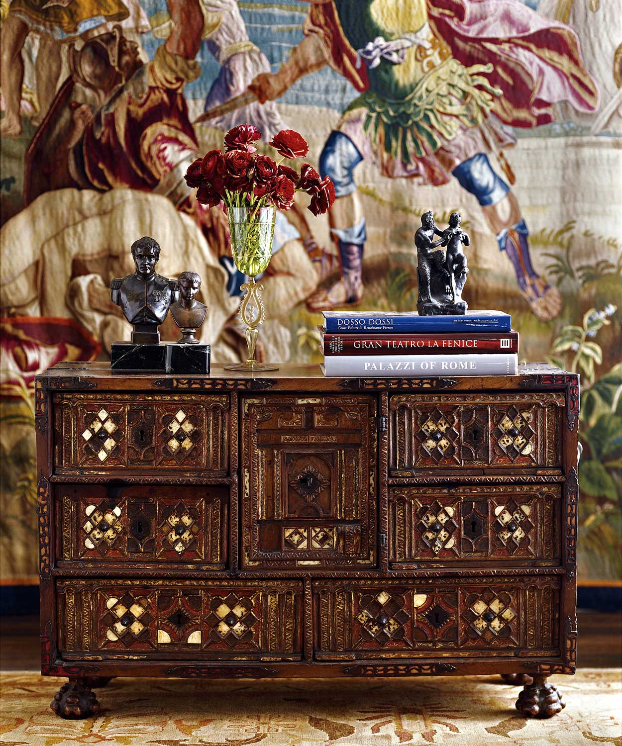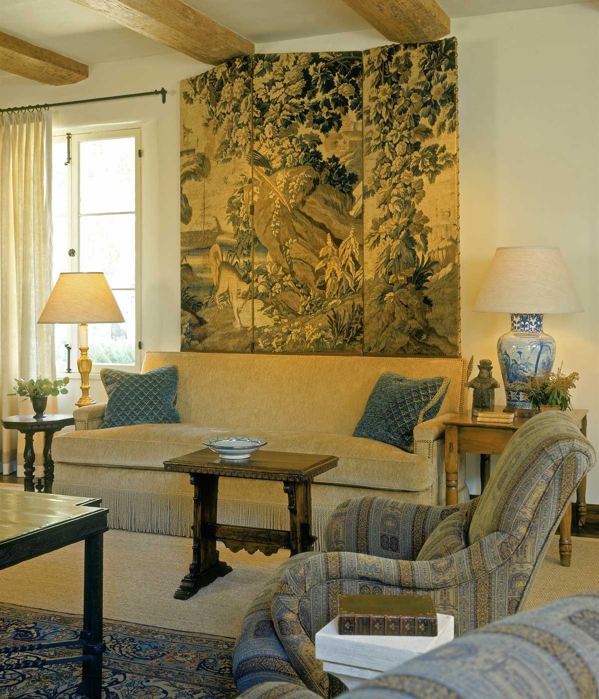 Practically speaking, these heavy hangings helped ward off the cold of a stone wall while warming up rooms visually with their splendor. Often designed by well-known artists of their day, and signed by renowned workshops, the best antique tapestries continue to dazzle, even in the twenty-first century. Here are a few rooms we designed that hold tapestries of faded grandeur or brilliant color.