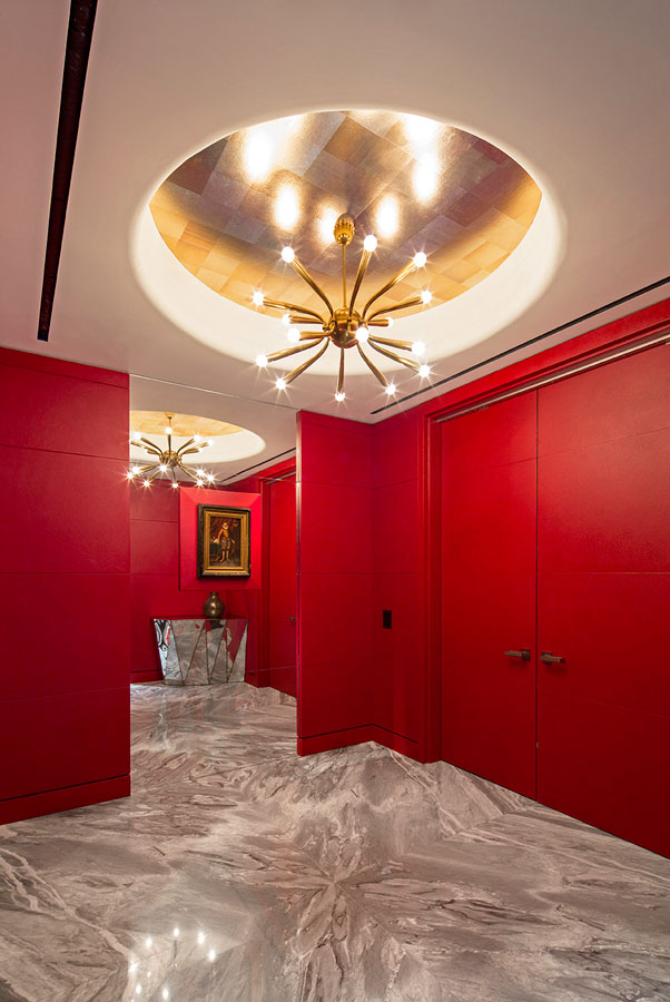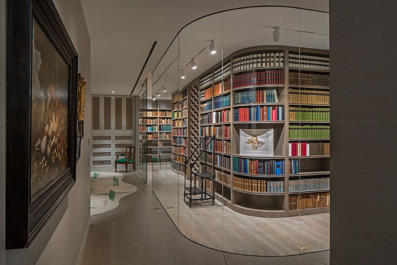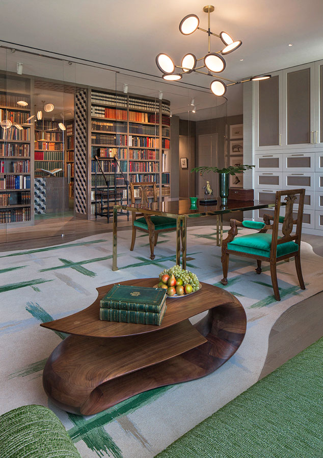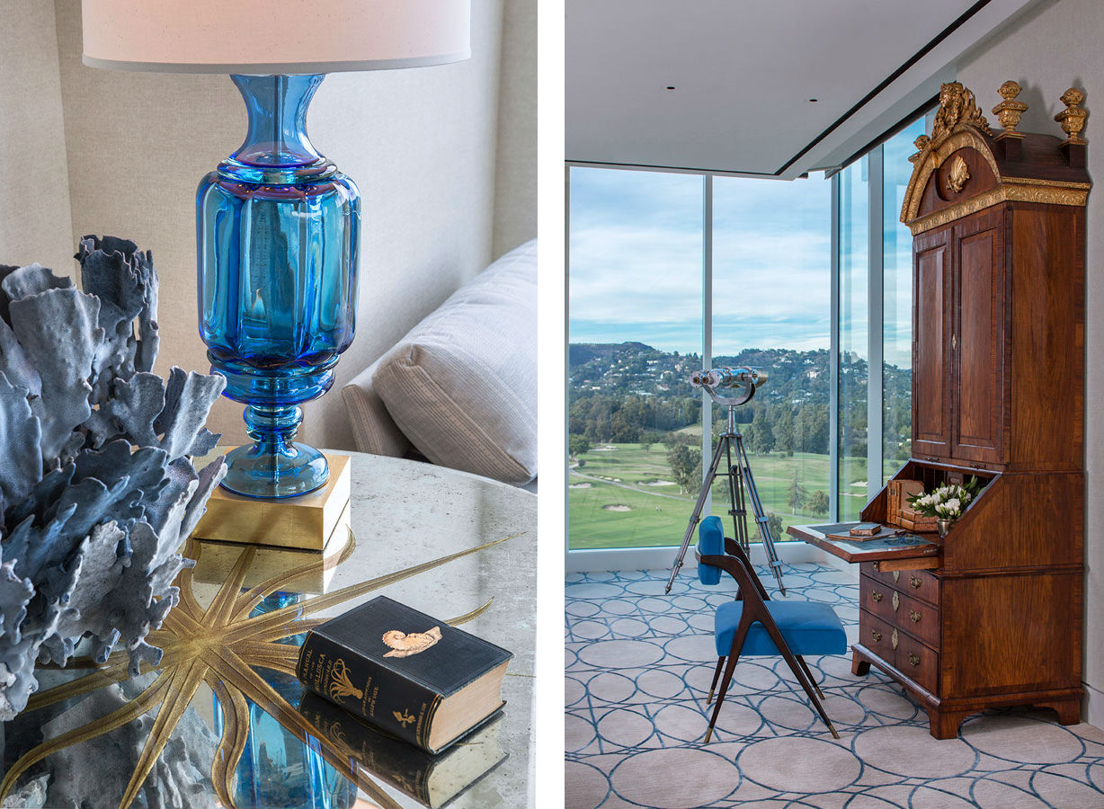For a passionate collector of books and antique engravings about nature – particularly sea life – we transformed 8,000 square feet of raw space into a bibliophile’s paradise. Centered on an amazing, glass – enclosed library housing precious works from as far back as the Renaissance, this modern aerie is about as far as you can get from Hollywood – standard, but certainly cinematic. To enhance the uniqueness of the home, we designed a number of custom elements that subtly reference nature and the aquatic, such as a screen of bubble – like forms in Venetian glass and a sinuous bar clad in hammered silver. To balance some of these more whimsical details, we incorporated select antiques that created another connection to the serious collection that anchors the heart of the home.