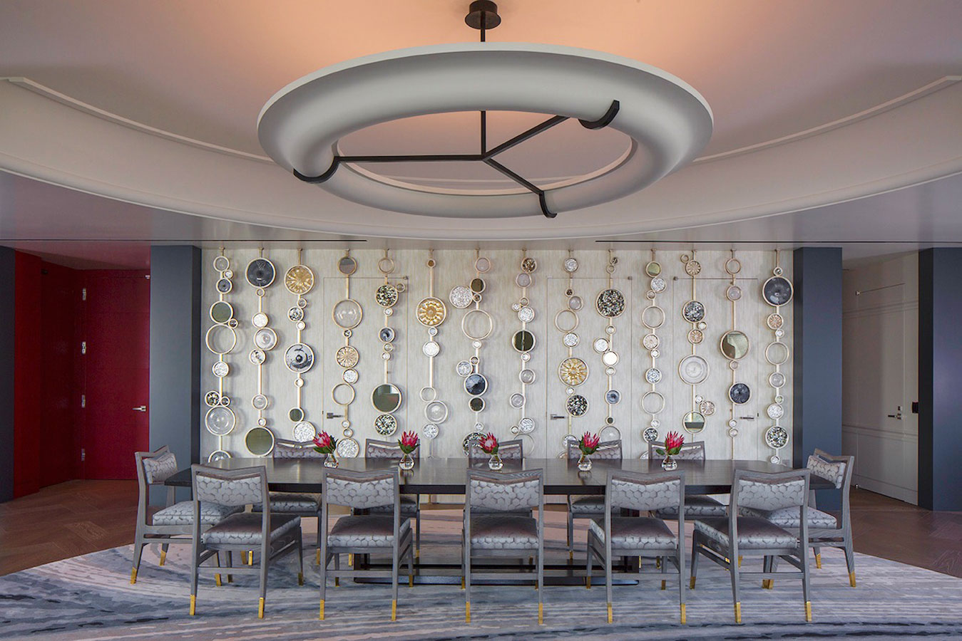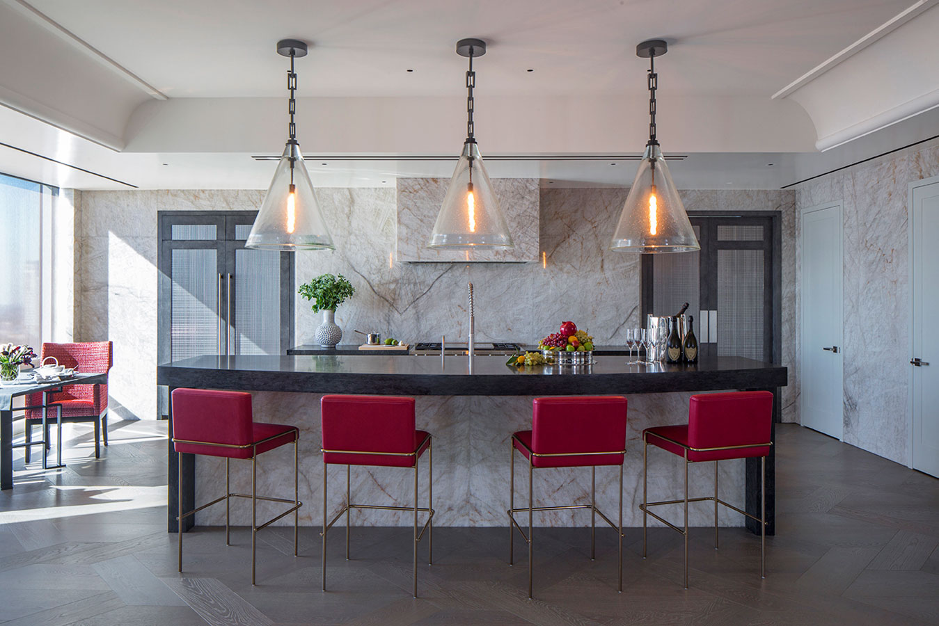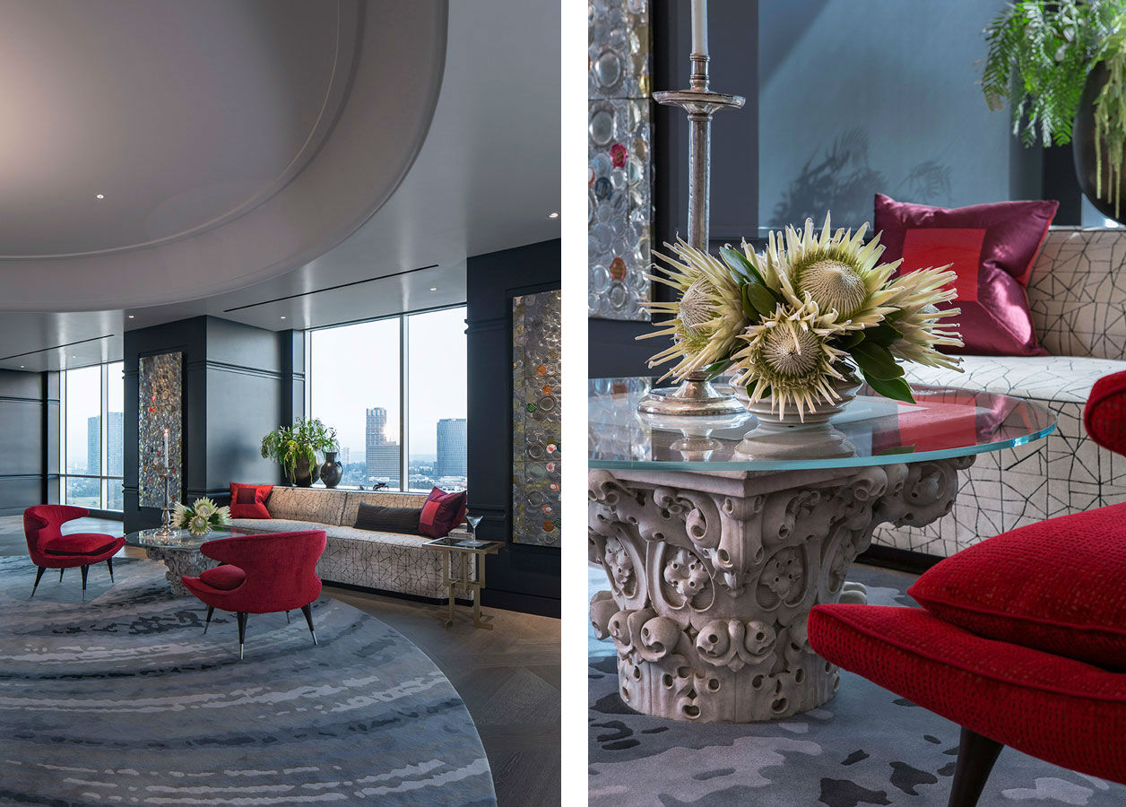 For a passionate collector of books and antique engravings about nature – particularly sea life – we transformed 8,000 square feet of raw space into a bibliophile’s paradise. Centered on an amazing, glass – enclosed library housing precious works from as far back as the Renaissance, this modern aerie is about as far as you can get from Hollywood – standard, but certainly cinematic. To enhance the uniqueness of the home, we designed a number of custom elements that subtly reference nature and the aquatic, such as a screen of bubble – like forms in Venetian glass and a sinuous bar clad in hammered silver. To balance some of these more whimsical details, we incorporated select antiques that created another connection to the serious collection that anchors the heart of the home.