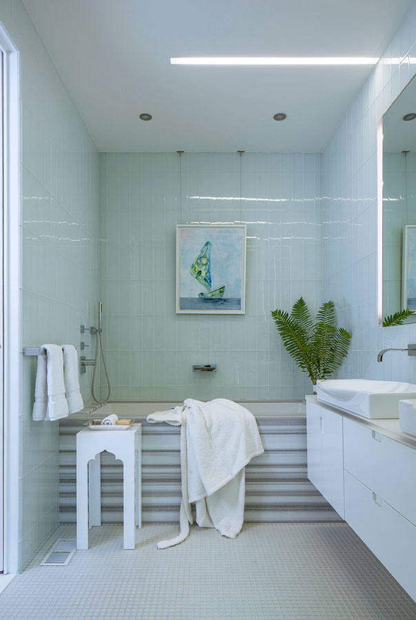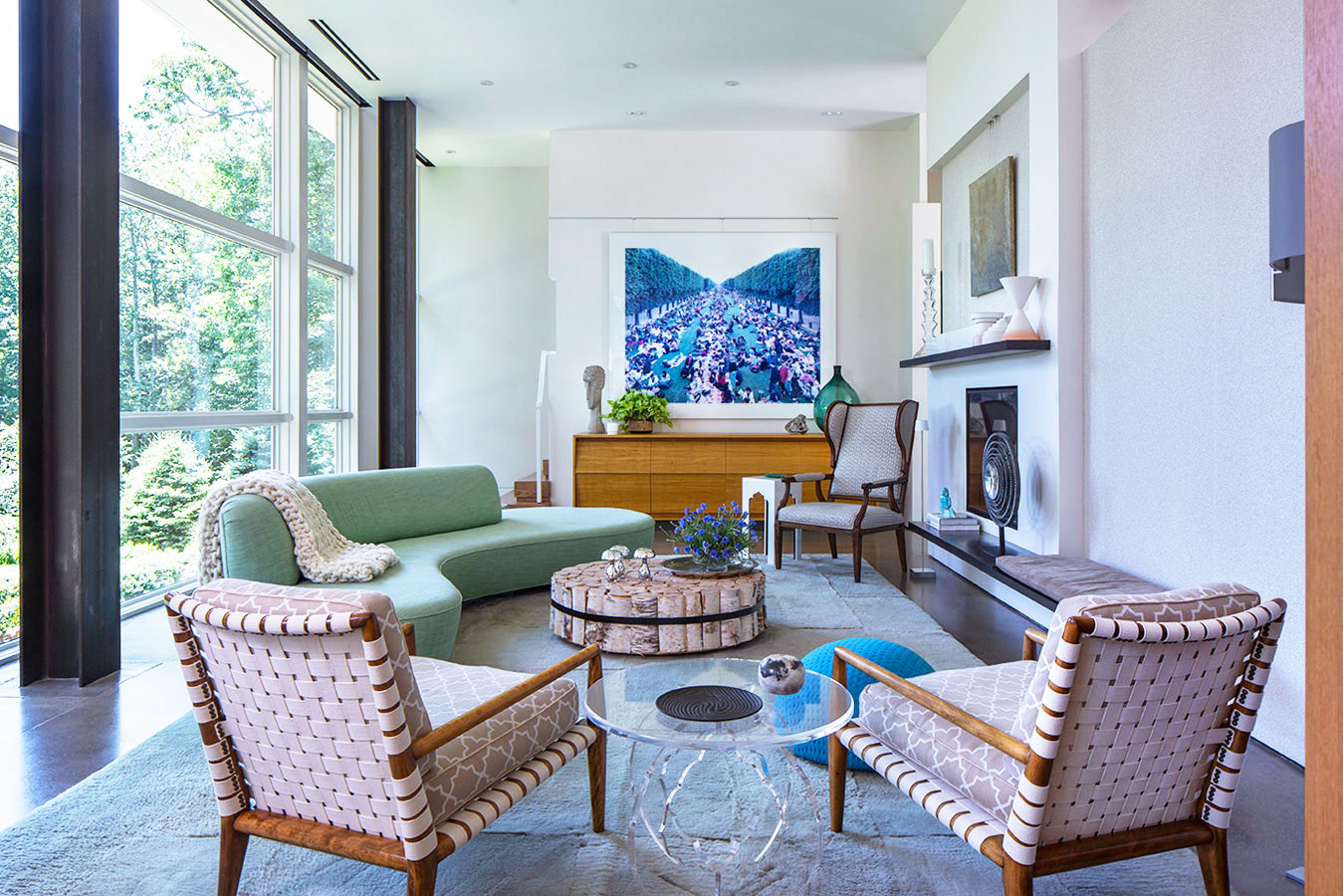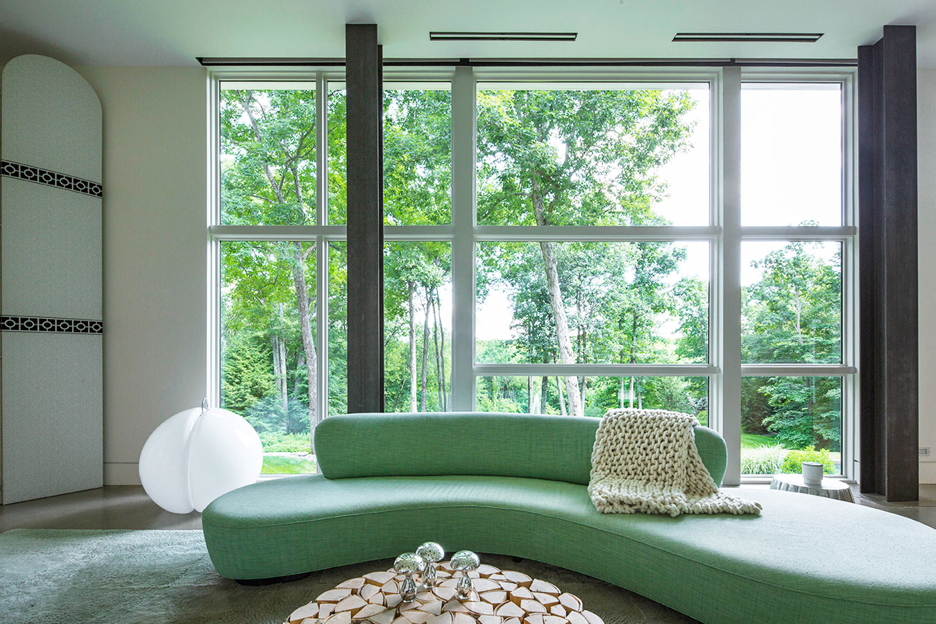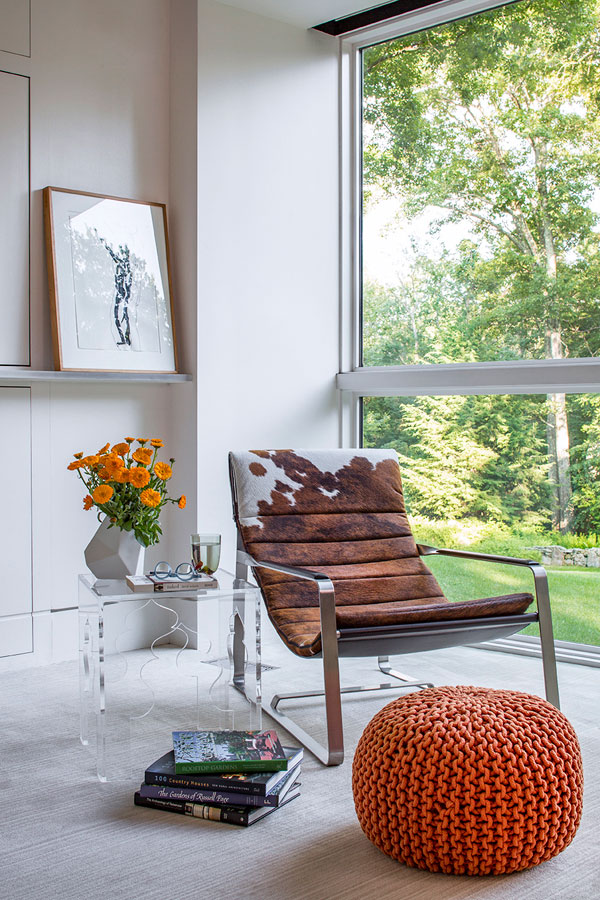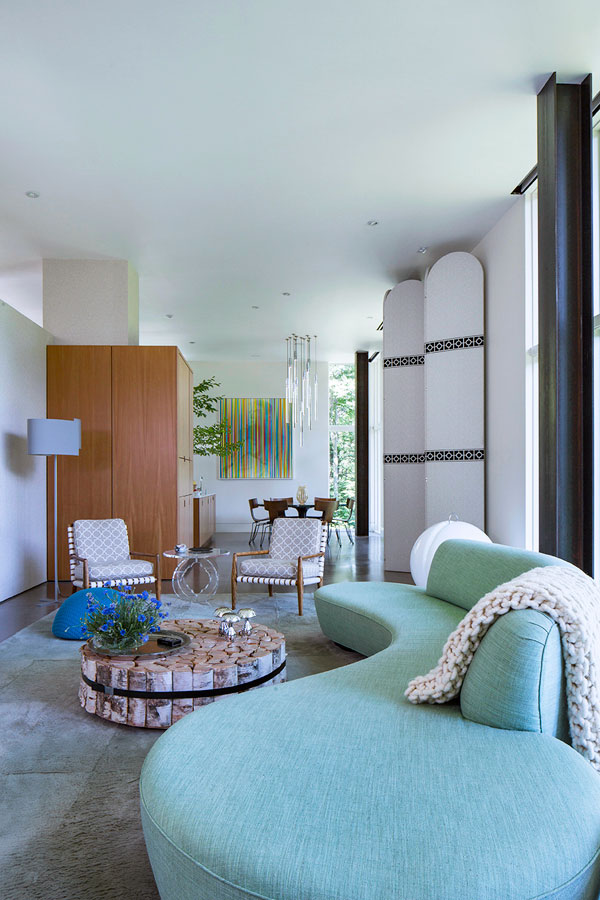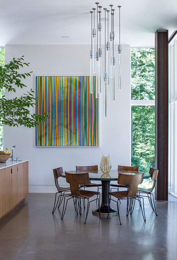 Concrete, steel and glass may strike some as cold, but in the hands of White Webb, it’s anything but. For this weekend home in upstate New York, we emphasized the connection to the outdoors by establishing a foundation of natural materials (linens, leathers, and warm woods), which we layered with verdant greens and other poppy colors from the landscape. Bold, contemporary artwork anchors the rooms while creative contrasts – such as the pairing of a sinuous Kagan sofa with a birch log coffee table or a lacquered Fornasetti dining table with more austere, leather-clad Klismos chairs – make for a vibrant interior that is uncluttered, but far from minimal.