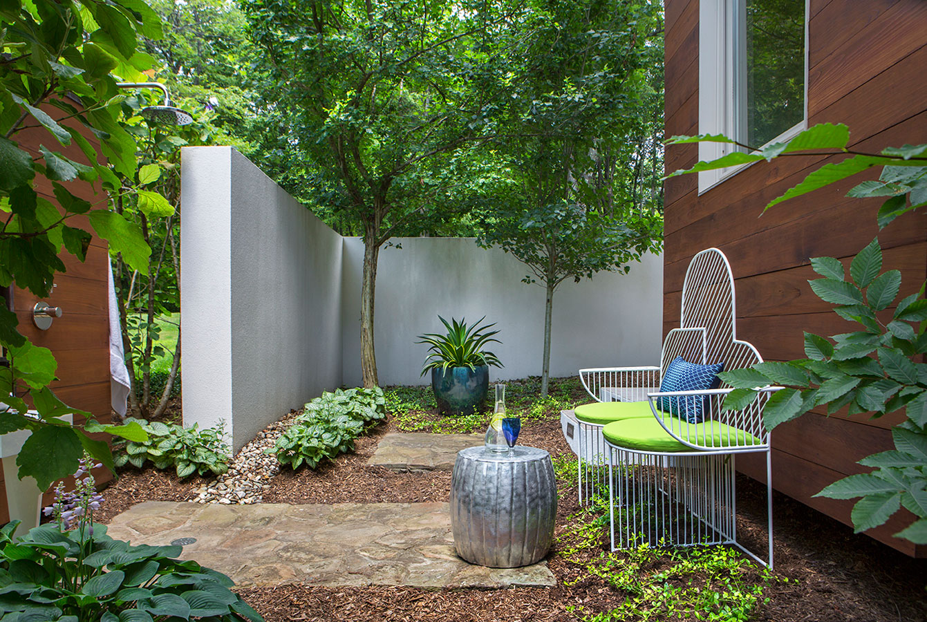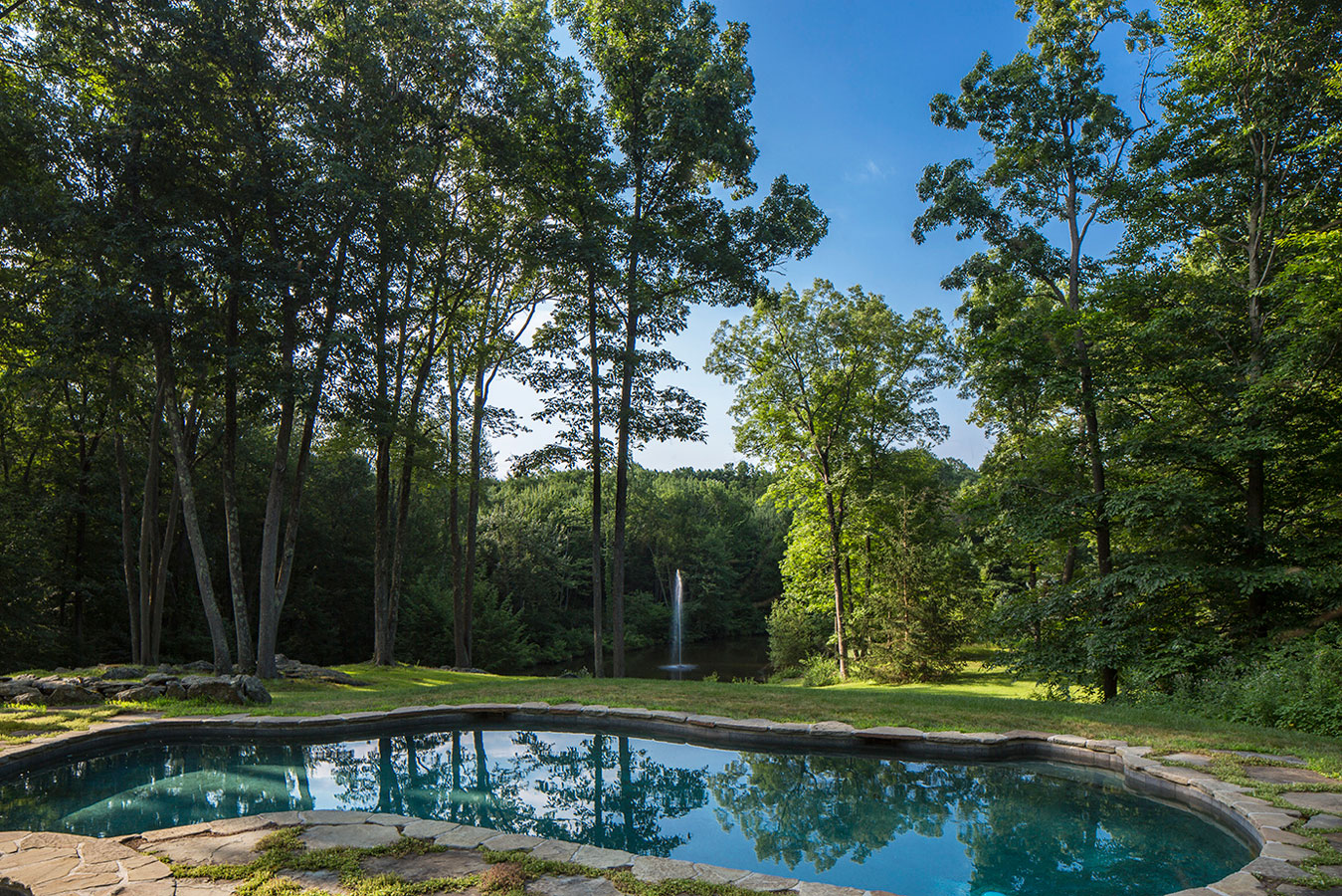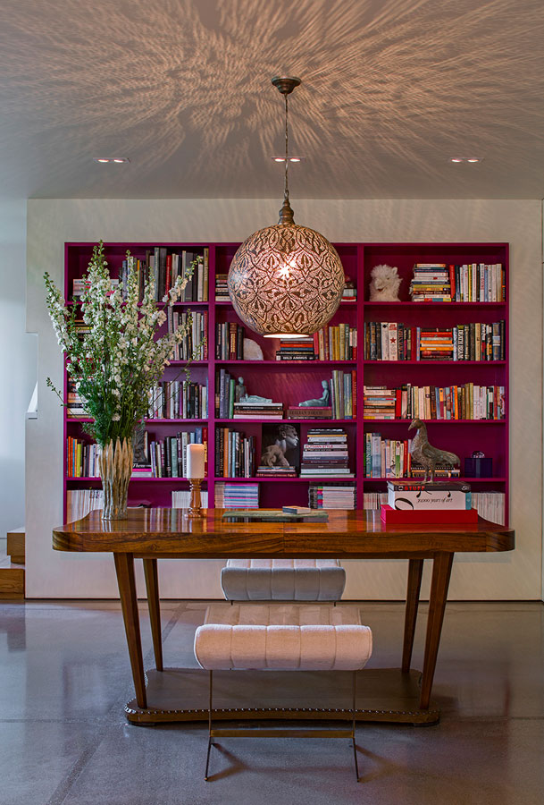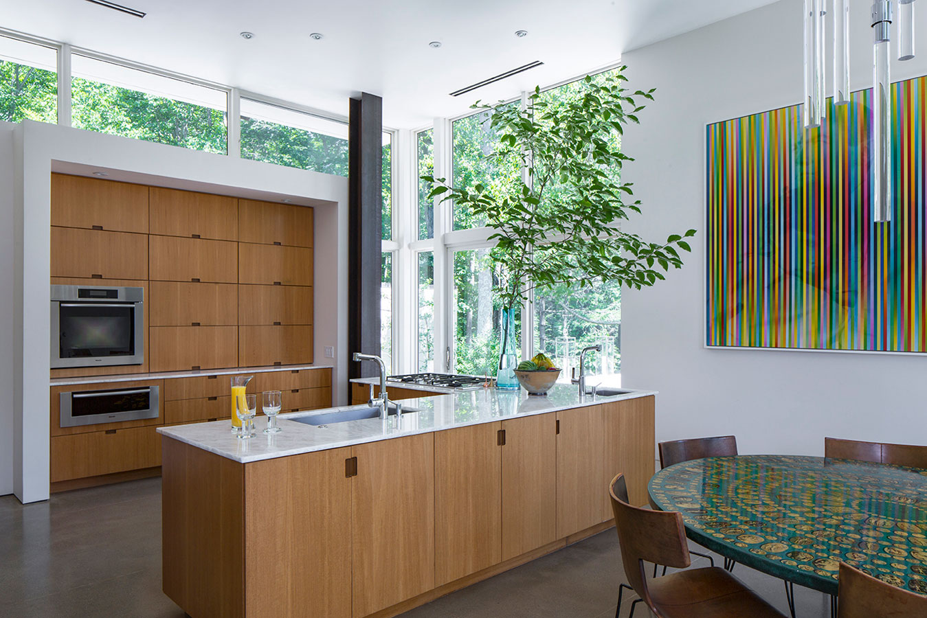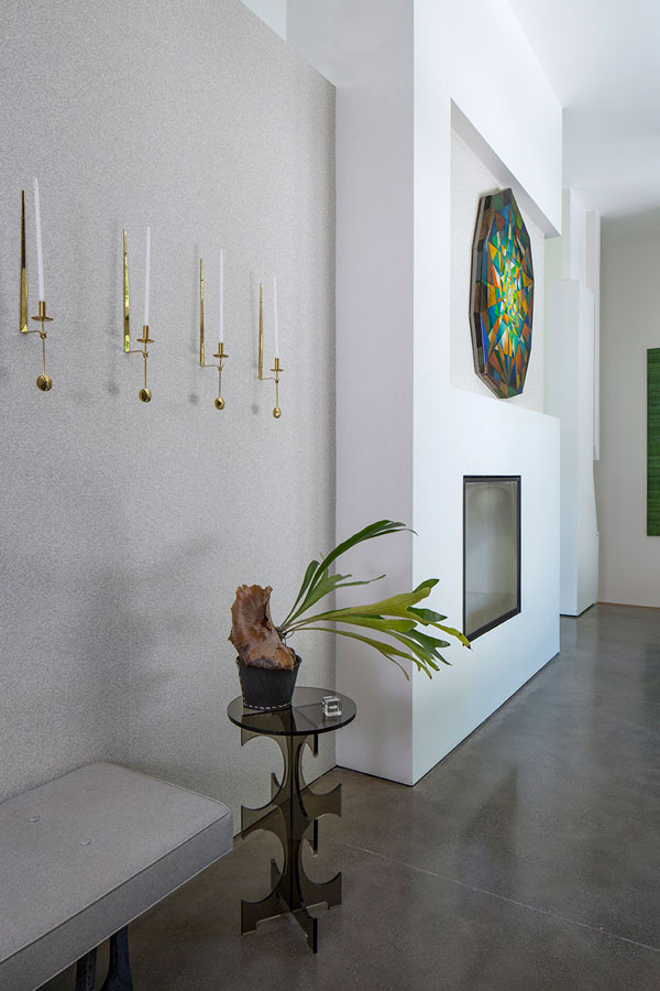 Concrete, steel and glass may strike some as cold, but in the hands of White Webb, it’s anything but. For this weekend home in upstate New York, we emphasized the connection to the outdoors by establishing a foundation of natural materials (linens, leathers, and warm woods), which we layered with verdant greens and other poppy colors from the landscape. Bold, contemporary artwork anchors the rooms while creative contrasts – such as the pairing of a sinuous Kagan sofa with a birch log coffee table or a lacquered Fornasetti dining table with more austere, leather-clad Klismos chairs – make for a vibrant interior that is uncluttered, but far from minimal.