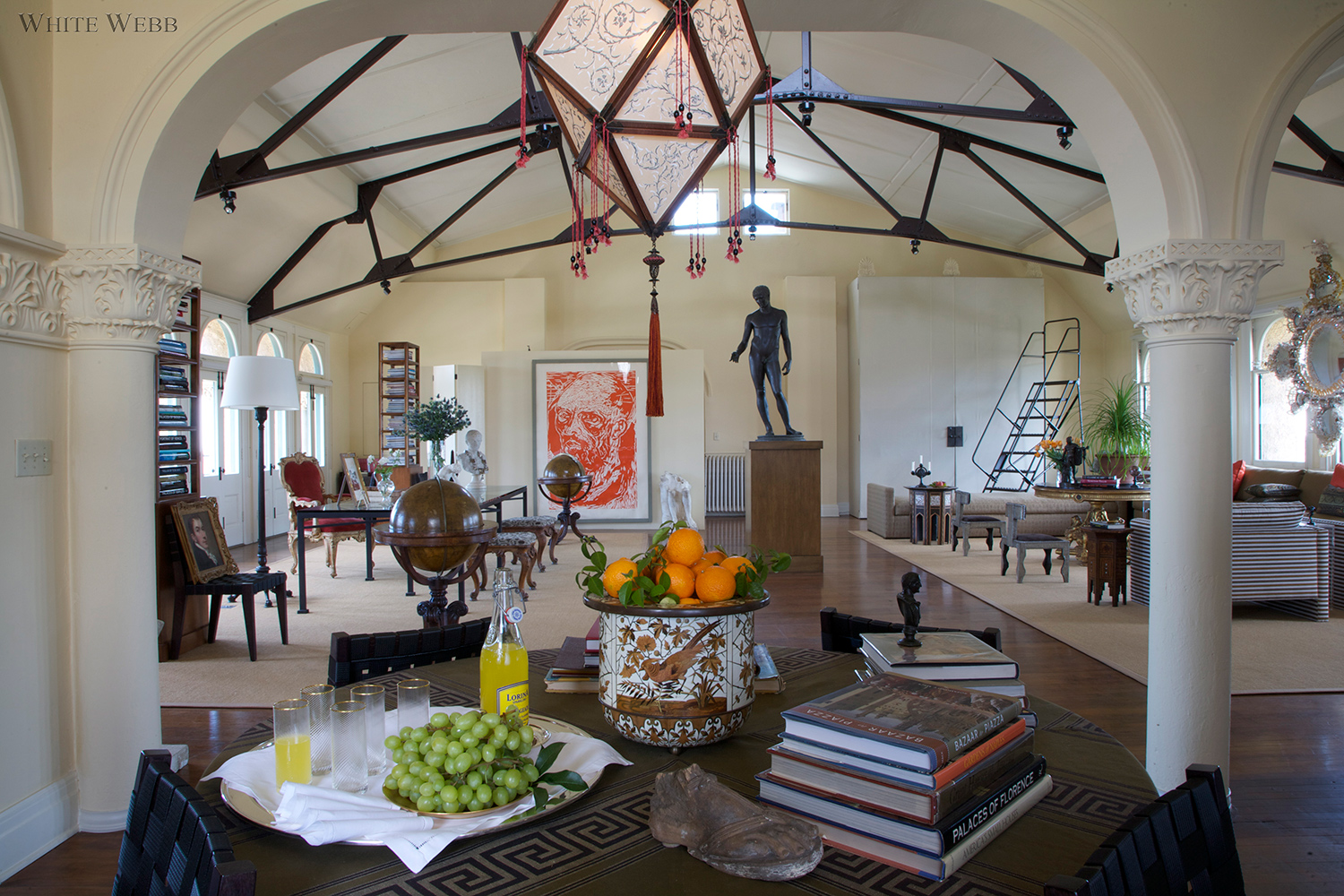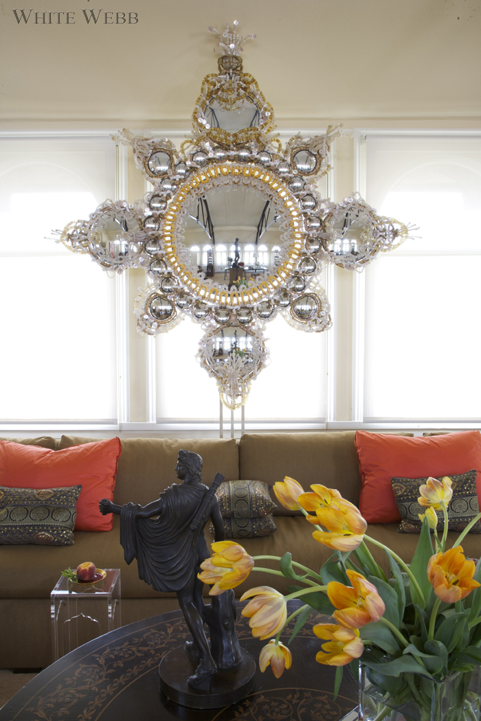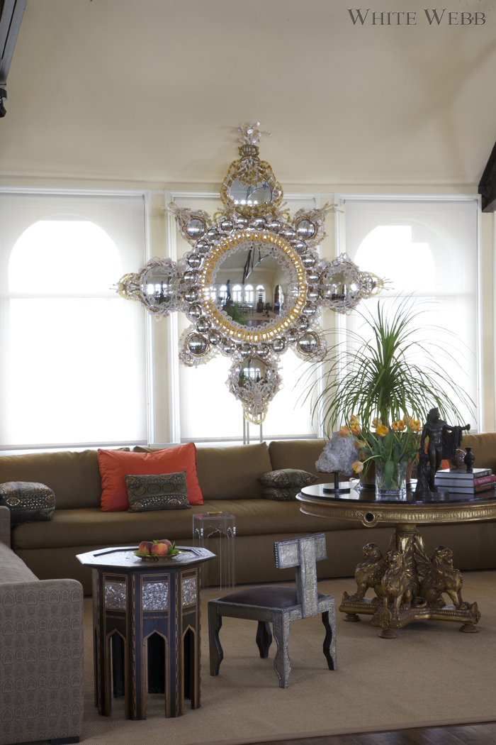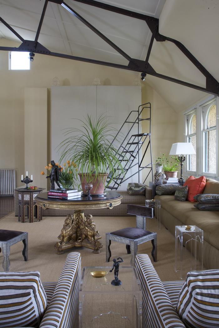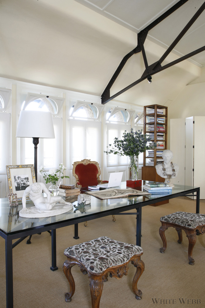 What does one do with a historic roof garden atop an old hotel, now turned into a magical loft? Besides thank one’s lucky stars, some serious design thought must go into the plan. Here, the enormous room was broken into sections: seating, dining, entry and study. The key was to keep things open yet make it feel like a real home in which one could be equally comfortable hanging out alone or hosting a fabulous cocktail party. Modern upholstery designed by White Webb was combined with grand tour souvenirs and antiques to create a history-laden aerie that feels like the ultimate modern loft.
