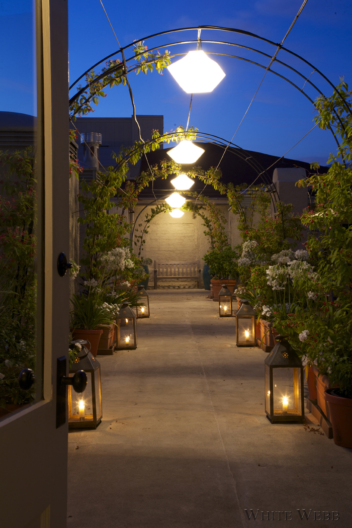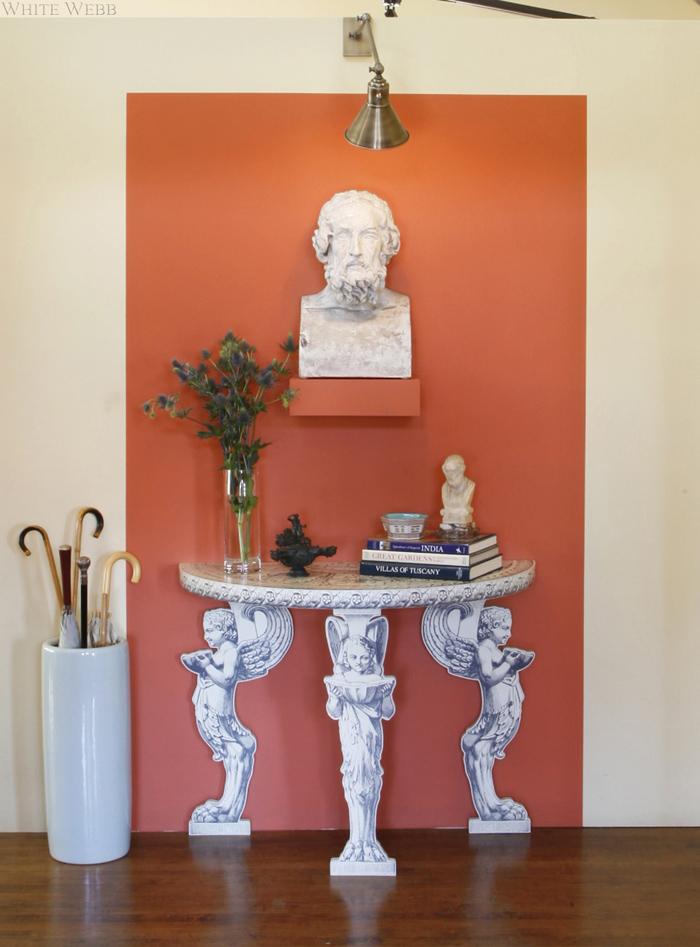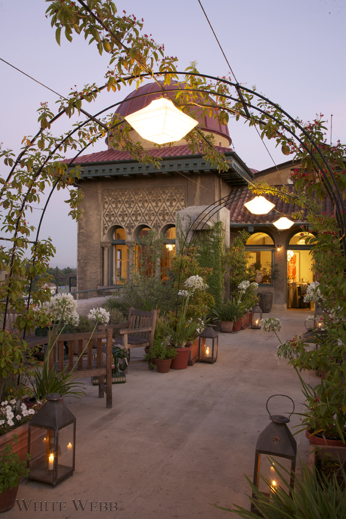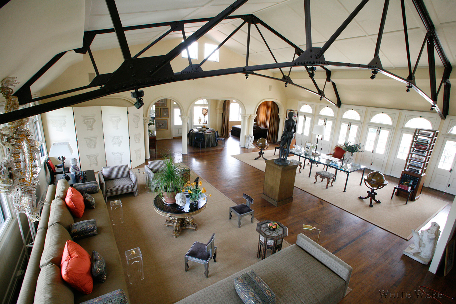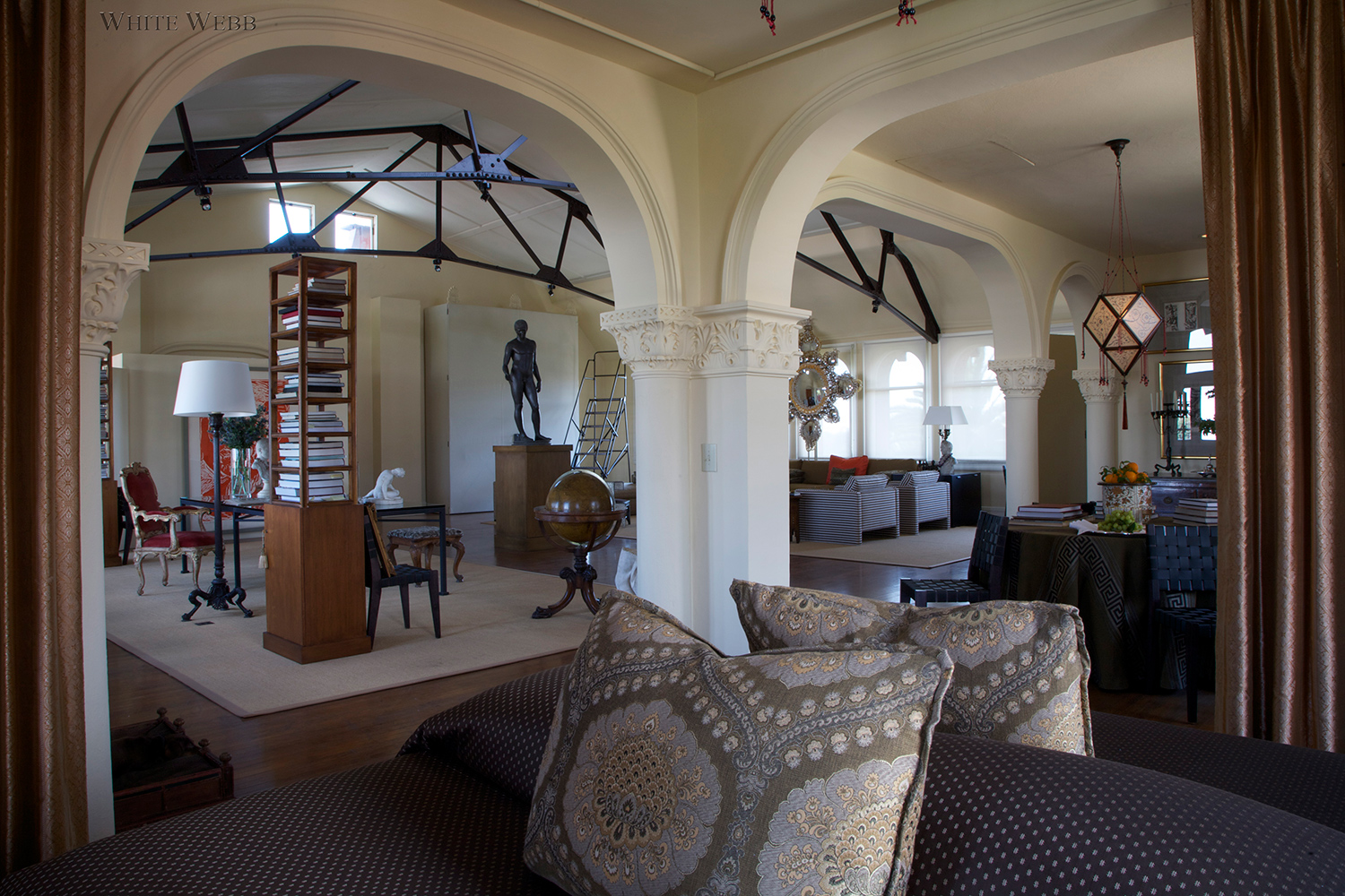 What does one do with a historic roof garden atop an old hotel, now turned into a magical loft? Besides thank one’s lucky stars, some serious design thought must go into the plan. Here, the enormous room was broken into sections: seating, dining, entry and study. The key was to keep things open yet make it feel like a real home in which one could be equally comfortable hanging out alone or hosting a fabulous cocktail party. Modern upholstery designed by White Webb was combined with grand tour souvenirs and antiques to create a history-laden aerie that feels like the ultimate modern loft.