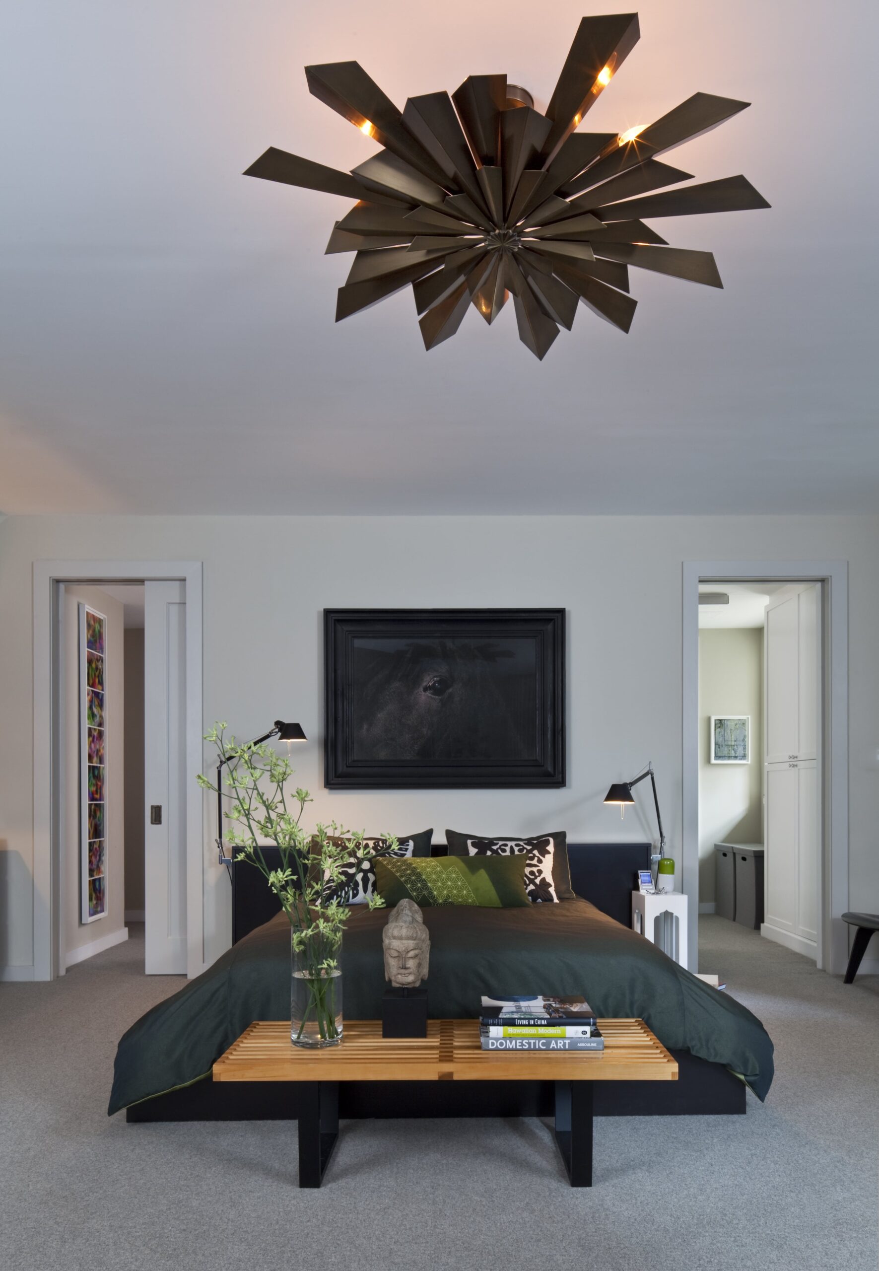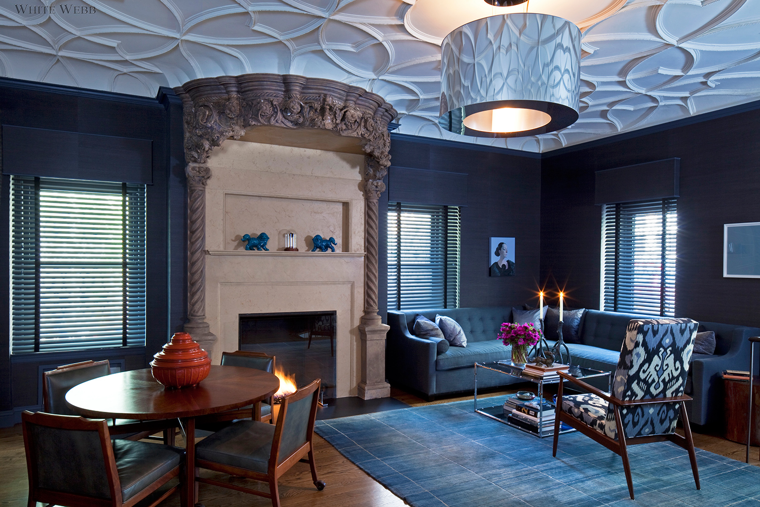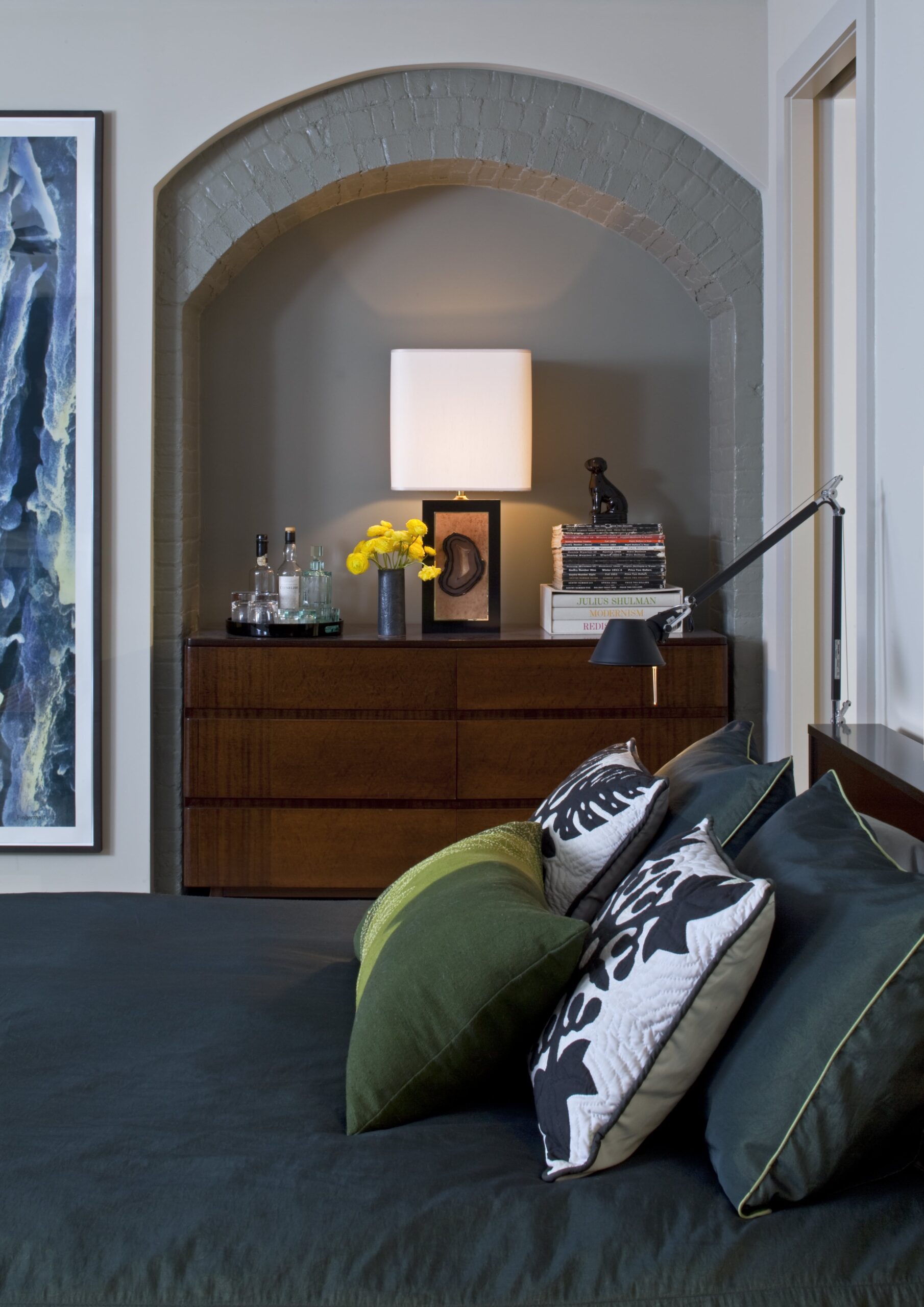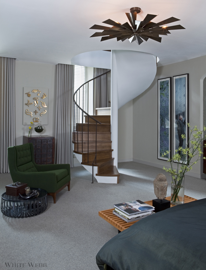 For us, there’s nothing more satisfying than to see a home reach its fullest potential. In this case, we were blessed with a duplex apartment with extremely interesting bones, and a client that was eager to let us play archaeologist. In addition to restoring the living room’s highly unusual fireplace and romantic tracery ceiling, we completely reinvented the rest of the home’s layout to improve function and flow. With a swank gentlemen’s club as our design inspiration, we chose deep saturated colors for the public rooms, which not only set a masculine tone, but also provided the perfect backdrop for the client’s impressive art collection. By blending in bold, futuristic lighting and clean mid-century furnishings, we punched up the contrast, making for interiors that feel fresh and dramatic.